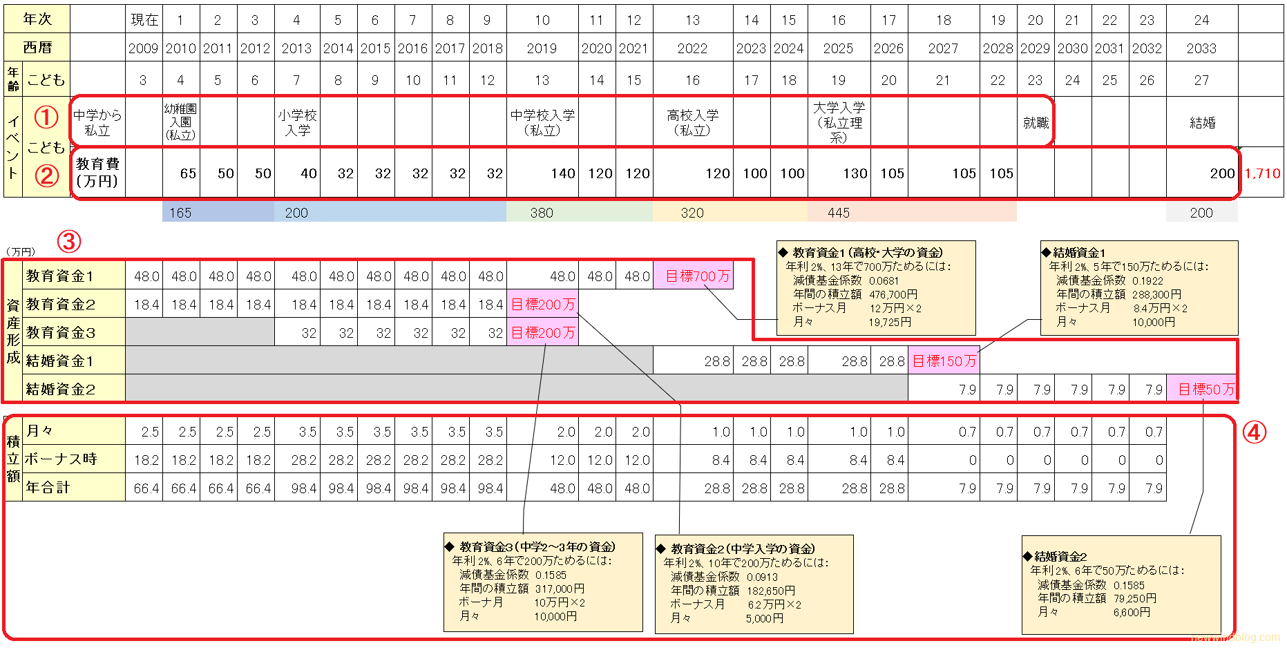→ 教育資金1(高校・大学の教育費): 3歳~15歳に700万円